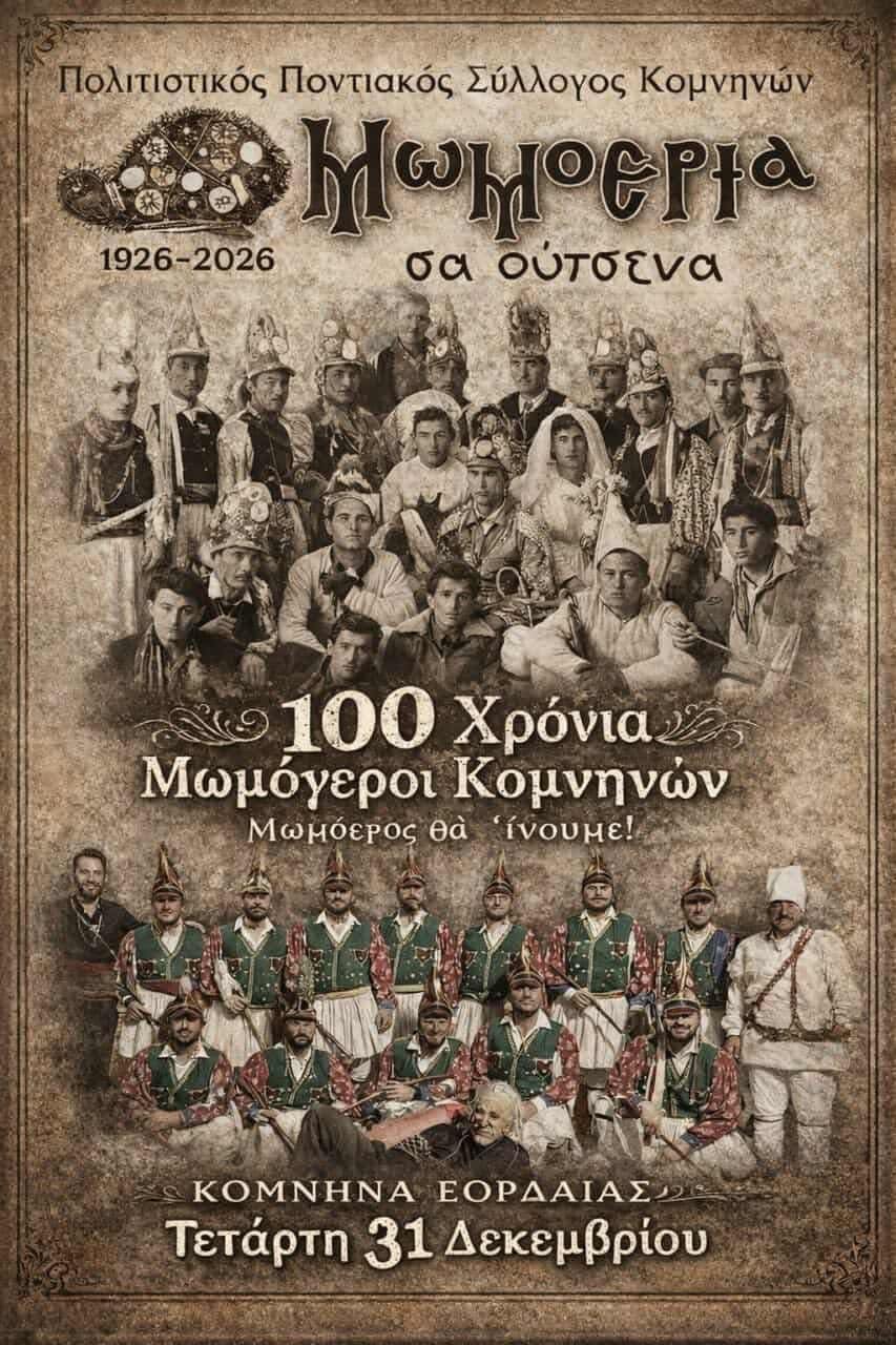 Η 100ή επέτειος –οποιαδήποτε 100ή επέτειος– είναι σίγουρα μια μεγάλη στιγμή, πόσο μάλλον όταν πρόκειται για την αναβίωση ενός εθίμου από την αλησμόνητη πατρίδα, και ακόμα περισσότερο όταν αυτή η επέτειος αφορά ένα ποντιακό σωματείο που έχει έμβλημά του την περικεφαλαία του μωμόγερου, όπως ο Πολιτιστικός Ποντιακός Σύλλογος Κομνηνών!