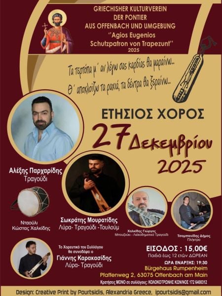 Την αγκαλιά του ανοίγει ο Ελληνικός Πολιτιστικός Σύλλογος Ποντίων Όφφενμπαχ και Περιχώρων «Άγιος Ευγένιος – Προστάτης της Τραπεζούντας», το Σάββατο 27 Δεκεμβρίου, στις 19:30, για τα μέλη και τους φίλους του και διοργανώνει τον πρώτο ετήσιο χορό του.