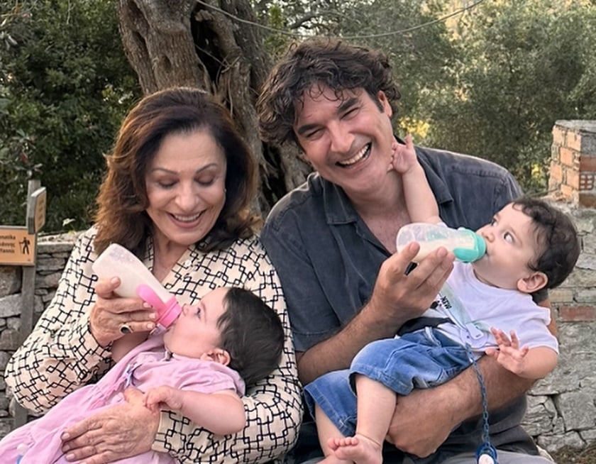 Με τη Χαρούλα Αλεξίου, σε ένα διάλειμμα των γυρισμάτων του Maestro όπου τάισαν μαζί δύο μικρούς επισκέπτες (φωτ.: Instagram christopherpapakaliatis)