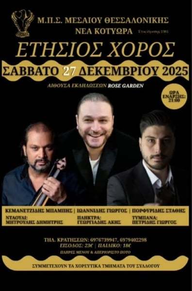 Τον ετήσιο χορό του οργανώνει σήμερα, Σάββατο, ο Μορφωτικός Πολιτιστικός Σύλλογος Μεσαίου Θεσσαλονίκης «Νέα Κοτύωρα», με τη συμμετοχή των χορευτικών του τμημάτων.
