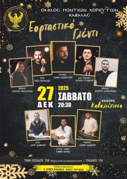 Εορταστικό γλέντι ετοιμάζει σήμερα, Σάββατο, ο Όμιλος Ποντίων Χορευτών Καβάλας. Τη βραδιά θα πλαισιώσουν οι Γιάννης Κατωτοικίδης στο τραγούδι, Κυριάκος Γερμανίδης στη λύρα και το τραγούδι, Ηλίας Παγκαλίδης στη λύρα, Ασημένια Πουσραϊτίδου και Δημήτρης Χαραλαμπίδης στο τραγούδι, Γιάννης Καμπάς στο αγγείο, Σάκης και Γιάννης Ιωαννίδης στα πλήκτρα.