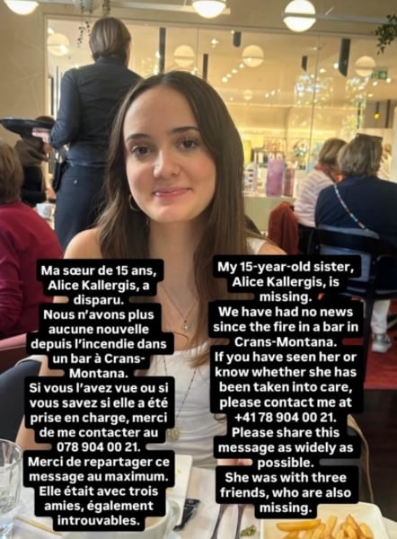 Μια νεαρή Ελληνοελβετή είναι ανάμεσα στους αγνοούμενους μετά τη φονική φωτιά στο Κραν Μοντανά της Ελβετίας. Με αναρτήσεις στα μέσα κοινωνικής δικτύωσης, η μητέρα και ο αδελφός της 15χρονης Αλίκης Καλλέργη κάνουν έκκληση σε όποιον έχει πληροφορίες για τη νεαρή η οποία διασκέδαζε με την παρέα της στην περιοχή και δεν έχει δώσει σημεία ζωής.