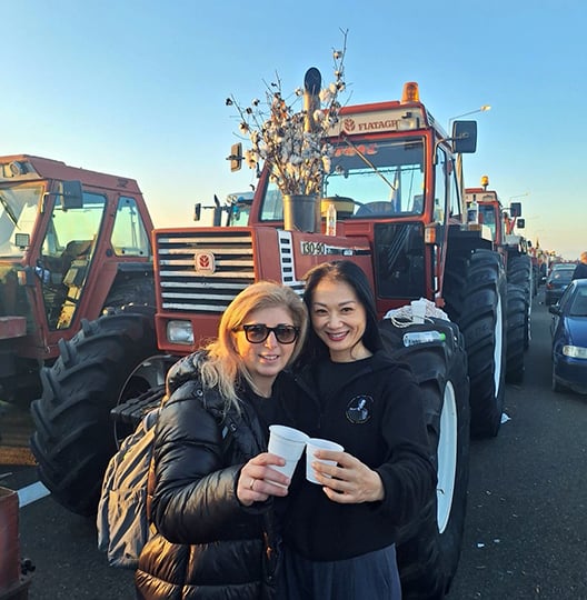 Αμέσως ήρθαν ανάμεσά μας και άρχισαν να κινούνται και αυτοί με το ρυθμό. Χορευτές και αγρότες γίναμε ένα. Εμείς τους δώσαμε τα εδέσματα που είχαμε κρατήσει γι’ αυτούς από την εκδήλωση στη Λάρισα, πιροσκία και ωτία. Αυτοί μας κέρασαν τα κρασιά τους. Χορέψαμε και τραγουδήσαμε. Δηλώσαμε την υποστήριξή μας στον αγώνα τους. Όταν φεύγαμε, μας χαιρέτησαν πατώντας τις κόρνες από τα τρακτέρ τους. Αμέσως ξέχασα όλη την ταλαιπωρία. Και πάλι συγκινήθηκα. Αυτή η αλληλεγγύη που έχει ο κόσμος εδώ, αυτό το να βοηθάει ο ένας τον άλλον, πολύ μου αρέσει!