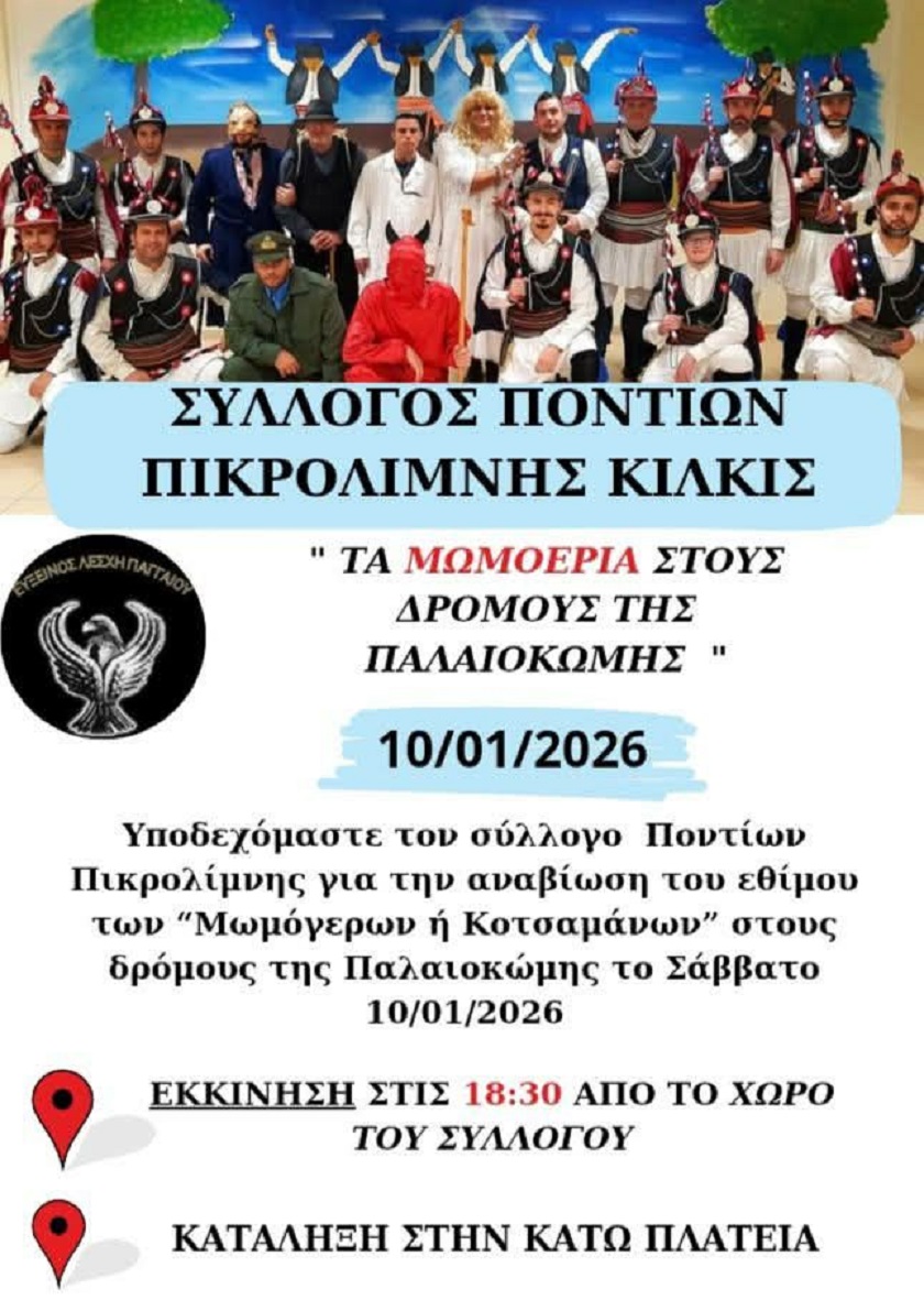 Την αναβίωση των Μωμόγερων ή Κοτσαμάνων φιλοξενούν η Εύξεινος Λέσχη Παγγαίου και ο Πολιτιστικός Σύλλογος Πικρολίμνης Κιλκίς, σε μια γιορτινή πομπή που θα ξεκινήσει στις 18:30 από τον χώρο του συλλόγου και θα καταλήξει στην κάτω πλατεία της Παλαιοκώμης. Με παραδοσιακές φορεσιές, μουσική, χορό και αυτοσχέδιους διαλόγους, οι συμμετέχοντες θα δώσουν ζωή σε ένα δρώμενο βαθιά ριζωμένο στην ποντιακή παράδοση, που συνδέεται με τον κύκλο του χρόνου και την αναγέννηση.