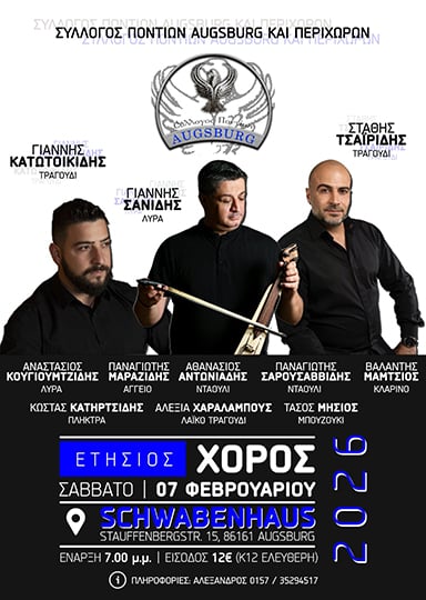 Ο Σύλλογος Ποντίων Άουγκσμπουργκ και Περιχώρων προσκαλεί στον ετήσιο χορό του, το Σάββατο 7 Φεβρουαρίου στο Schwabenhaus (Stauffenbergstr. 15, 86161 Augsburg).