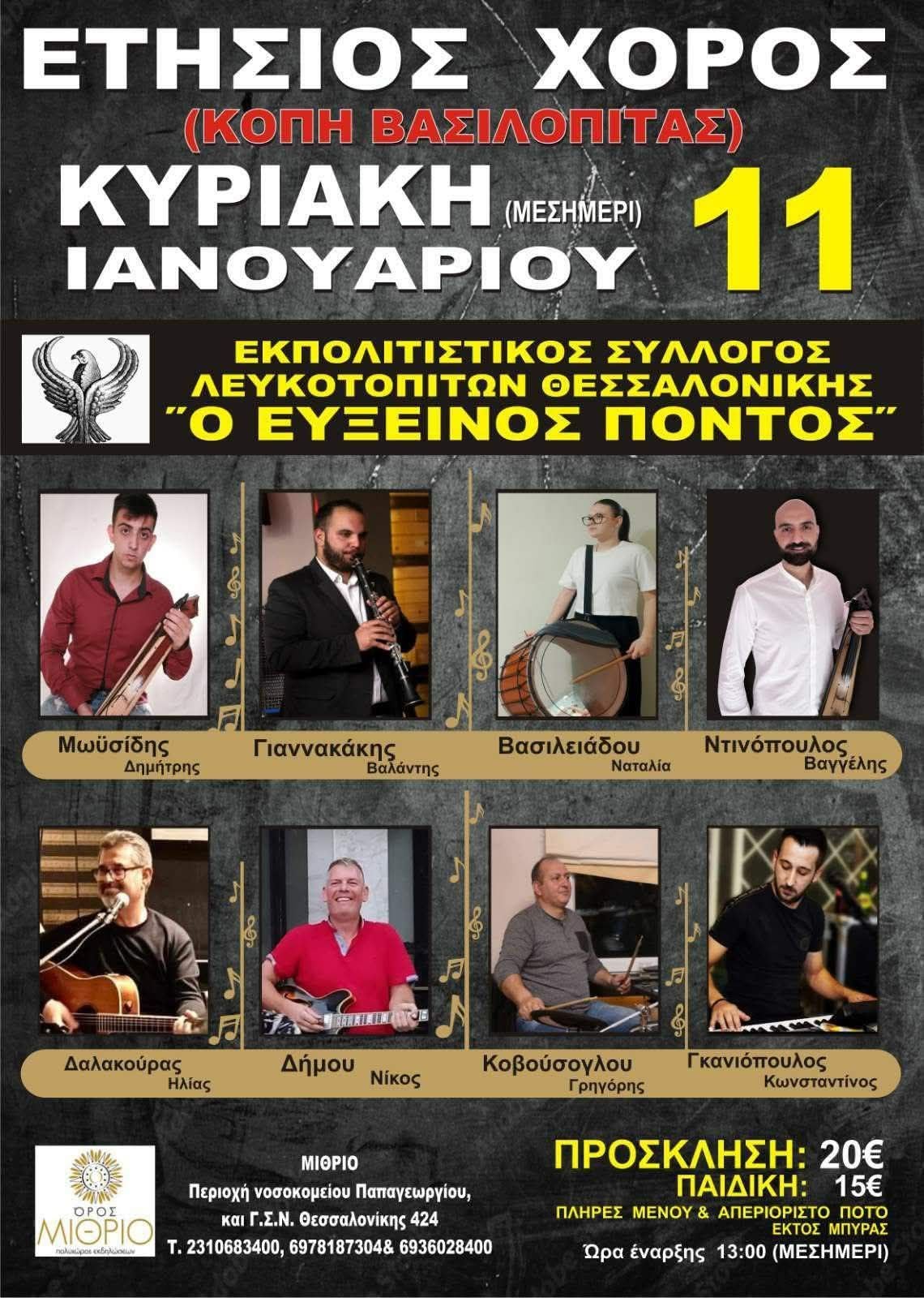 Σε εορταστικό κλίμα και με έντονο άρωμα ποντιακής παράδοσης, ο Εκπολιτιστικός Σύλλογος Λευκοτοπιτών Θεσσαλονίκης «Ο Εύξεινος Πόντος» προσκαλεί τα μέλη και τους φίλους του στον ετήσιο χορό και την κοπή της βασιλόπιτας, που θα πραγματοποιηθούν την Κυριακή 11 Ιανουαρίου, το μεσημέρι, στον φιλόξενο χώρο του Μίθριου.