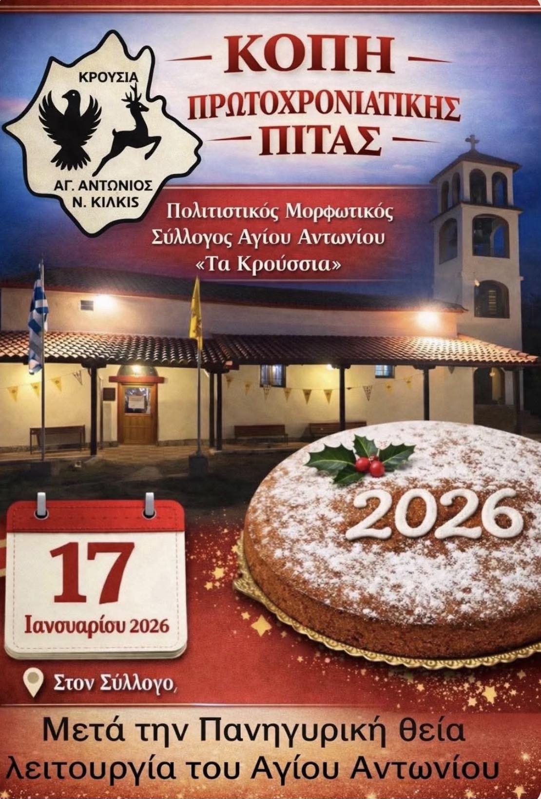 Σε κλίμα κατάνυξης και εορταστικής διάθεσης, ο Πολιτιστικός Μορφωτικός Σύλλογος Αγίου Αντωνίου Κρουσσίων απευθύνει ανοιχτό κάλεσμα στα μέλη και τους φίλους του για την κοπή της Πρωτοχρονιάτικης πίτας του συλλόγου, που θα πραγματοποιηθεί την Παρασκευή 17 Ιανουαρίου 2026.