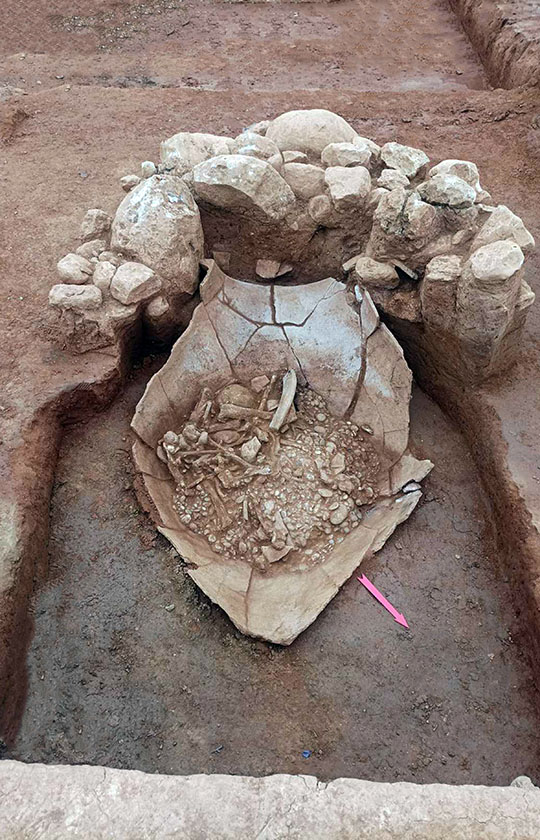Στο εσωτερικό, πάνω σε στρώμα από άμμο και βότσαλα, βρέθηκαν οστά δύο ατόμων, καλυμμένα από μεγάλες πέτρες που καταλάμβαναν σχεδόν όλο τον διαθέσιμο χώρο.