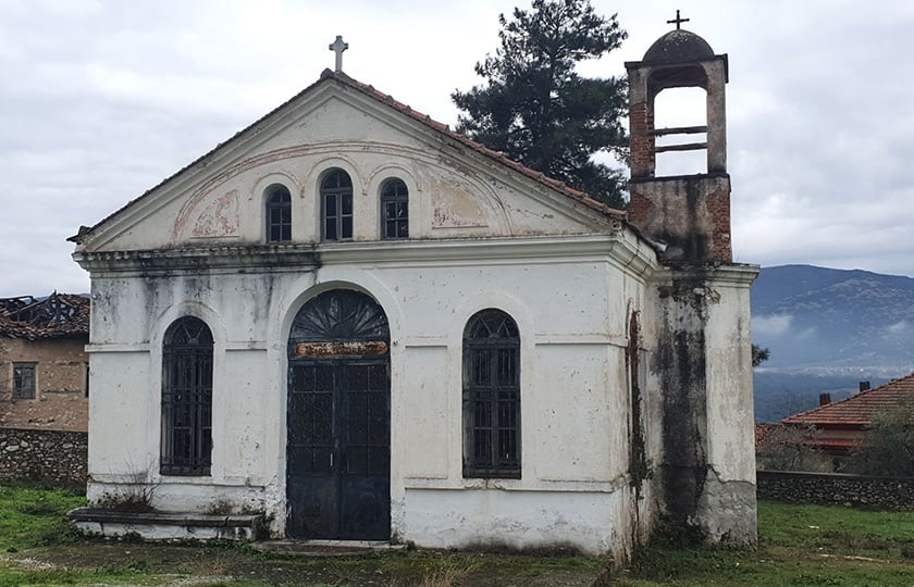 Ο υφιστάμενος ναός λειτούργησε μέχρι το 1980 οπότε και κατασκευάστηκε ο νέος. Ολόκληρος ο ναός είναι πετρόχτιστος αλλά καλυμμένος με σοβά. Στο μέσον του περιβάλλοντος χώρου δεσπόζει ένα παλιό σιντριβάνι, ενώ δυτικά διακρίνονται οι ερειπωμένοι τοίχοι του παλιού γυμνασίου.