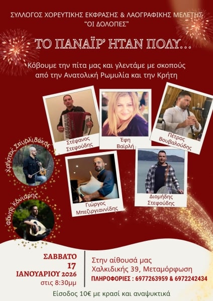 Η βραδιά θα αρχίσει στις 20:30, στην αίθουσα του σωματείου, στη Μεταμόρφωση Αττικής, στην οδό Χαλκιδικής 39.