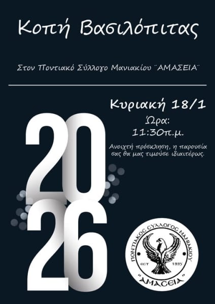Τη βασιλόπιτά τους θα κόψουν την Κυριακή 18 Ιανουαρίου τα μέλη του Ποντιακού Συλλόγου Μανιακίου «Αμάσεια».