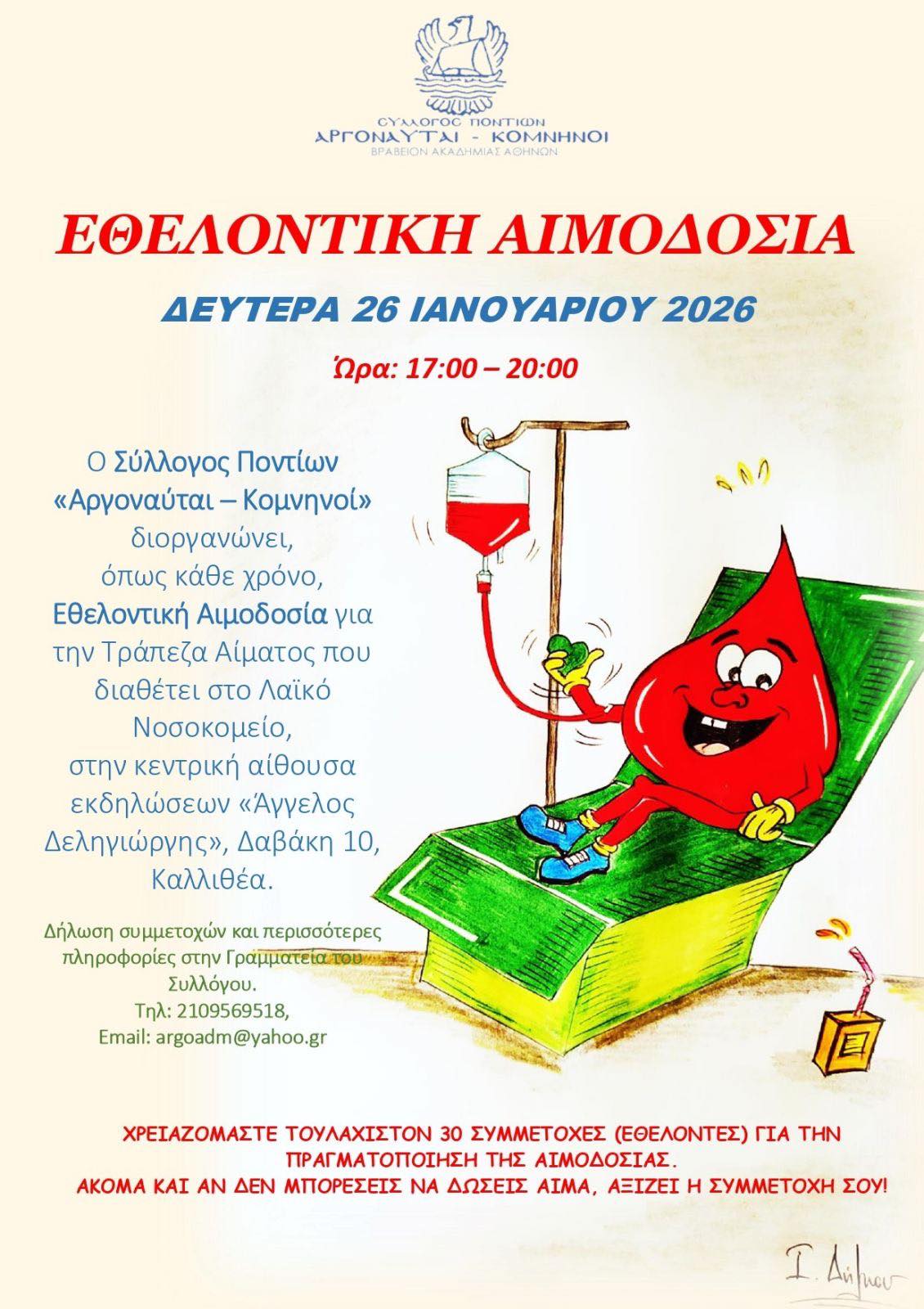 Την καθιερωμένη ετήσια εθελοντική αιμοδοσία του διοργανώνει και φέτος ο Σύλλογος Ποντίων «Αργοναύται-Κομνηνοί», τη Δευτέρα 26 Ιανουαρίου, από τις 17:00 έως τις 20:00.