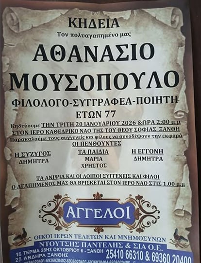 Tην τελευταία του πνοή άφησε χθες, παραμονή της γιορτής του, ο Ξανθιώτης συγγραφέας Θανάσης Μουσόπουλος, που ταύτισε το όνομά του με την ανάδειξη της πνευματικής και πολιτιστικής προσφοράς της Θράκης.