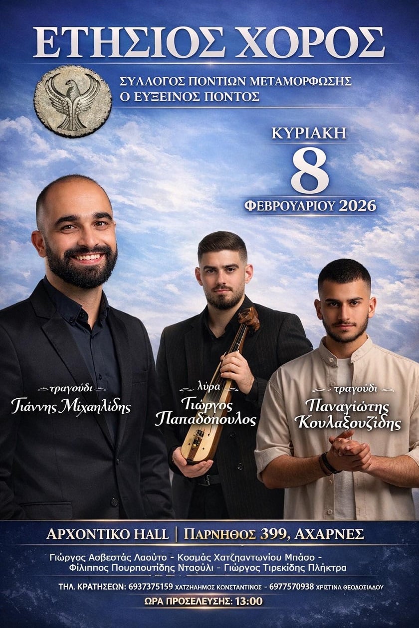 Ο Σύλλογος Ποντίων Μεταμόρφωσης «Ο Εύξεινος Πόντος» ετοιμάζει μια ξεχωριστή γιορτή για όλα τα μέλη και τους φίλους του. Την Κυριακή 8 Φεβρουαρίου, στις 13:00, το Αρχοντικό Hall στις Αχαρνές θα πλημμυρίσει με ποντιακές γεύσεις, ζωντανή μουσική και αστείρευτο κέφι.