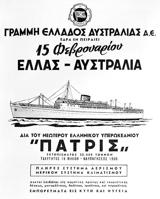 «Πατρίς» λοιπόν το υπερωκεάνιο. Και τι πιο ταιριαστό. Τον θείο Γιάννη τον έστειλε στην άλλη άκρη του κόσμου ο πατέρας του έπειτα από πρόσκληση της μέλλουσας συζύγου, πολλούς και πολλές άλλους η ίδια η πατρίδα. Πίσω από τη μαζική μετανάστευση βρισκόταν η περιβόητη ΔΕΜΕ (Διακυβερνητική Επιτροπή Μεταναστεύσεως εξ Ευρώπης / Intergovernmental Committee for European Migration – ICEM).