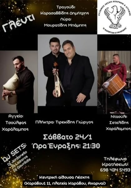 Η εκδήλωση θα πραγματοποιηθεί στην κεντρική αίθουσα της Λέσχης, Καράβου 11, πλατεία Καράβου, Αχαρνές, από τις 21:30, με είσοδο 5 ευρώ. Για κρατήσεις μπορείτε να επικοινωνείτε με το τηλέφωνο 698 4345493.