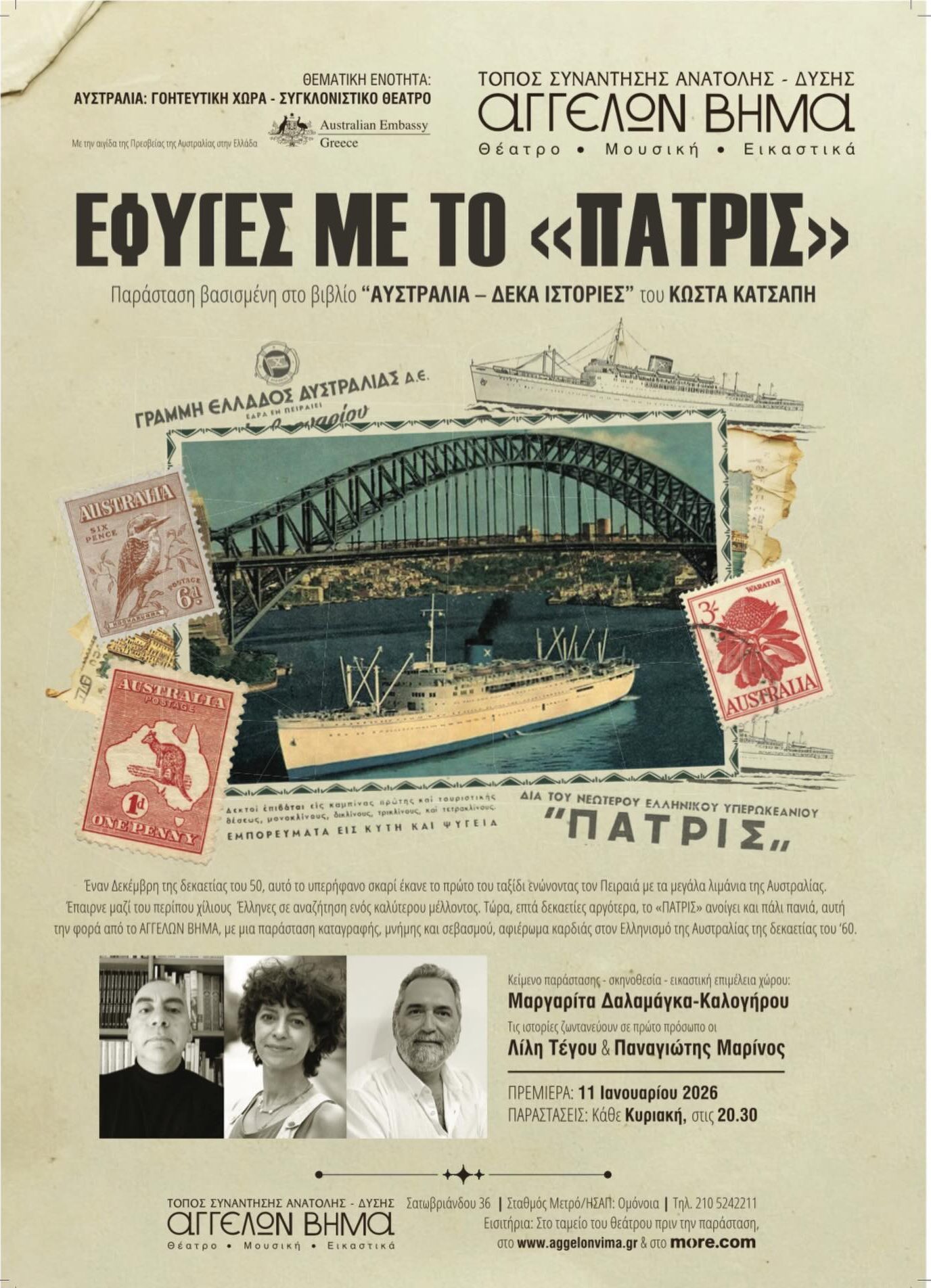 Ολόκληρη την καλλιτεχνική περίοδο Νοεμβρίου 2025 – Απριλίου 2026, το θέτρο «Αγγέλων βήμα» παρουσιάζει ένα αφιέρωμα με τίτλο «Αυστραλία: Γοητευτική χώρα – Συγκλονιστικό θέατρο», φιλοξενώντας έξι σύγχρονα θεατρικά έργα βραβευμένων Αυστραλών συγγραφέων διεθνούς κύρους και εμβέλειας. Μέσα σε αυτό το πλαίσιο, η φωνή των Ελλήνων μεταναστών της Αυστραλίας δεν θα μπορούσε να λείπει.
