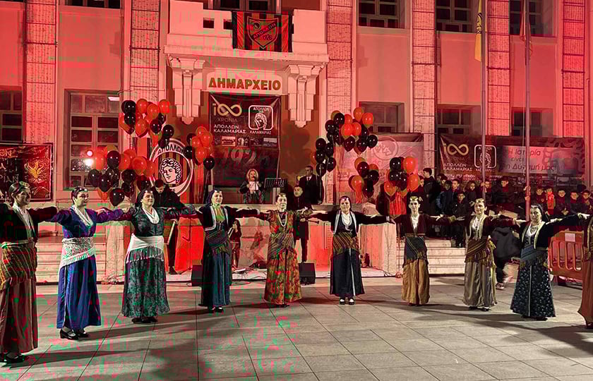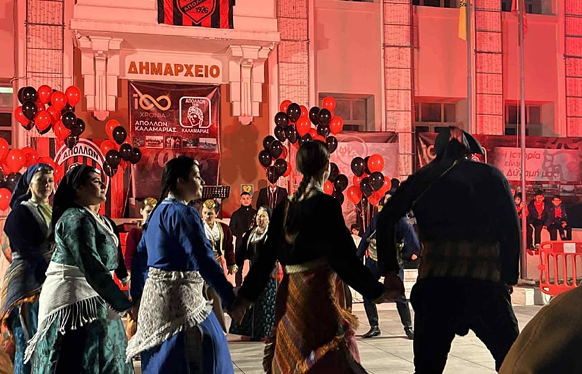 Ο ένας αιώνας ήταν η αφορμή χθες στην Καλαμαριά· για μουσική, χορό και προσφυγική μνήμη που ξεπερνά τα όρια ενός αθλητικού σωματείου. Χθες, το Δημαρχείο «βάφτηκε» κόκκινο από τον ΜΓΣΚ Απόλλωνα – από τα χρώματά του.