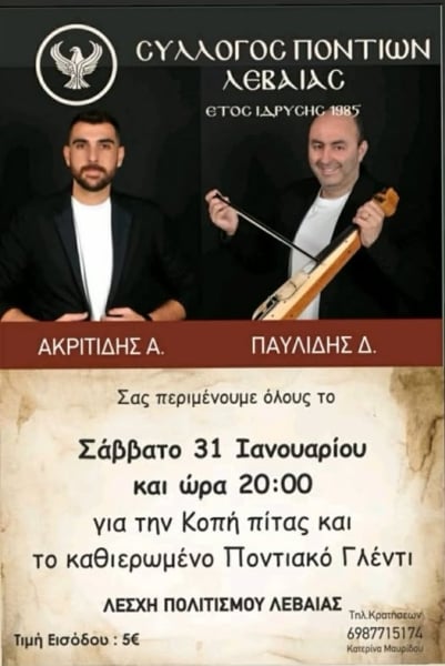 Με ένα ξεχωριστό ποντιακό γλέντι θα κόψει την καθιερωμένη βασιλόπιτα ο Σύλλογος Ποντίων Λεβαίας το Σάββατο 31 Ιανουαρίου.