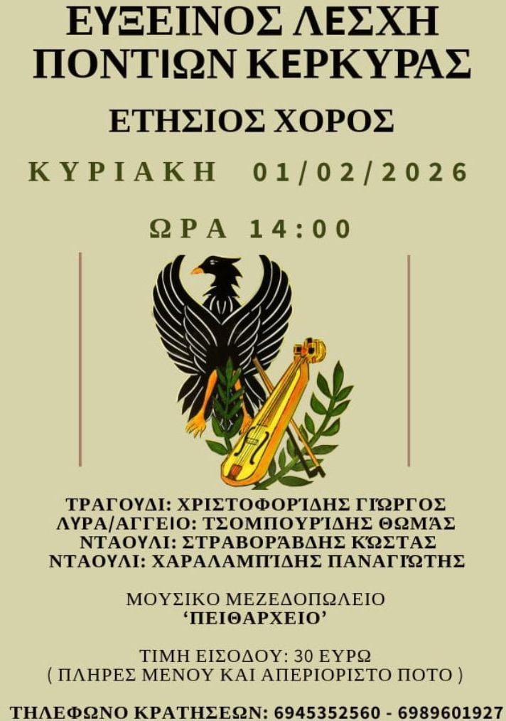 Η Εύξεινος Λέσχη Ποντίων Κέρκυρας προσκαλεί φίλους και μέλη της στον καθιερωμένο ετήσιο χορό της, που θα πραγματοποιηθεί την Κυριακή 1 Φεβρουαρίου, με ώρα έναρξης στις 14:00, σε μια γιορτή αφιερωμένη στην ποντιακή παράδοση και το αυθεντικό κέφι.