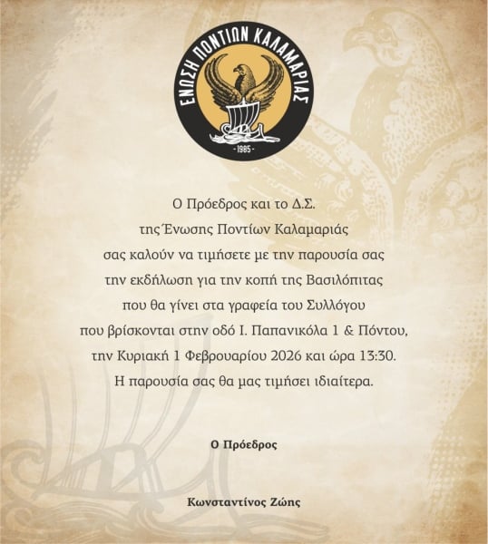 Η Ένωση Ποντιών Καλαμαριάς κόβει τη βασιλόπιτά της και καλεί όλους να δώσουν το παρών.