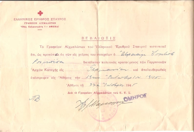 Ο πατέρας του πέρασε από το Άουσβιτς, το Ζαξενχάουζεν και κατέληξε στο Νταχάου, στο παράρτημα Κάουφερινγκ. Επέστρεψε τον Οκτώβριο του 1945 από τη Γερμανία, αφού απελευθερώθηκε από το Νταχάου. «Ο Ρομπίσα Αβραάμ του Γιομτώβ προερχόμενος εκ Γερμανίας τυγχάνει όμηρος», αναγράφεται στο πιστοποιητικό του Γραφείο Αλλοδαπών της Αστυνομικής Διεύθυνσης Πατρών, που διασώζεται μέχρι σήμερα, ενώ η βεβαίωση του Γραφείου Αιχμαλώτων του Ελληνικού Ερυθρού Σταυρού πιστοποιεί ότι «…ως προκύπτει εκ των εις χείρας του στοιχείων, ο Αβραάμ Γιομτώβ Ρομπίσα διετέλεσεν πολιτικός κρατούμενος των Γερμανικών Αρχών Κατοχής εις Γερμανίας και απελευθερωθείς επέστρεψεν εις Αθήνας την 19ην Οκτωβρίου 1945».