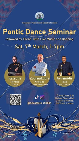 Με μια βουτιά στην ποντιακή παράδοση υπόσχεται να γιορτάσει τη συμπλήρωση ενός έτους από την ίδρυσή της η Ομάδα Ποντιακών Χορών «Σεβάστεια» που εδρεύει στο Λονδίνο, και ως πρώτο βήμα επέλεξε να διοργανώσει ένα σεμινάριο με τον Νίκο Ζουρνατζίδη.