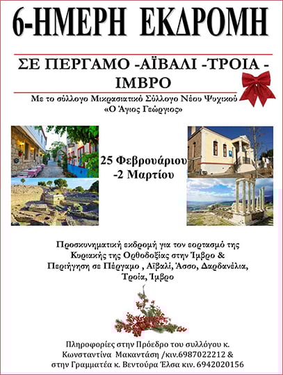 Επίσκεψη σε Ίμβρο, Τσεσμέ, Πέργαμο, Αϊβαλί, Άσσο, Δαρδανέλια και Τροία σχεδιάζει ο Μικρασιατικός Σύλλογος Νέου Ψυχικού «Άγιος Γεώργιος» από τις 25 Φεβρουαρίου έως τις 2 Μαρτίου, σε μια προσκυνηματική εκδρομή με αφορμή τον εορτασμό της Κυριακής της Ορθοδοξίας.