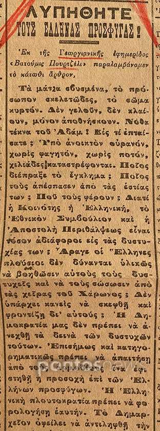 Χαρακτηριστικό είναι άρθρο που αναδημοσιεύει από μια γεωργιανή εφημερίδα, με τον εύγλωττο τίτλο «Λυπηθείτε τους Έλληνες πρόσφυγες», όπου η περιγραφή είναι ωμή: τα μάτια συνηθισμένα στη δυστυχία, τα σώματα σκελετωμένα, άνθρωποι που «δεν γελούν, δεν κλαίνε, μόνο αποθνήσκουν». Το ερώτημα τίθεται ανοιχτά: ποιος θα διασώσει τους δυστυχείς;