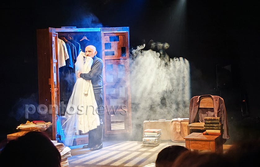 Οι θεατές στην πρεμιέρα του Ροδάφ’νου πολλοί, και –όπως είναι φυσικό– κατά το πλείστον Πόντιοι. Το σκηνικό απλό: μια ντουλάπα γεμάτη ρούχα, μερικές βαλίτσες γεμάτες μνήμες, ντάνες από βιβλία και εφημερίδες που σηματοδοτούν τη διέξοδο του πρωταγωνιστή από τη «γεωργία», από τα λασπωμένα χωράφια της καινούργιας πατρίδας.
