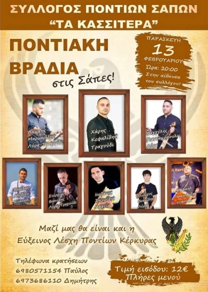 Ποντιακή βραδιά ετοιμάζει για την Παρασκευή 13 Φεβρουαρίου ο Σύλλογος Ποντίων Σαπών «Τα Κασσιτερά», μαζί με την Εύξεινο Λέσχη Ποντίων Κέρκυρας.
