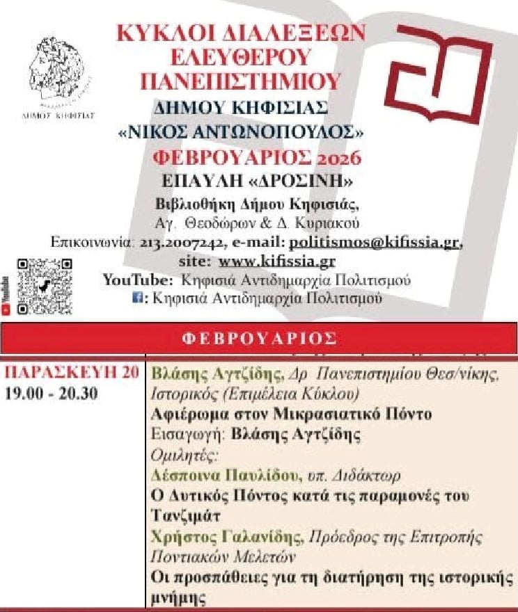 Συνεχίζονται οι κύκλοι διαλέξεων του Ελεύθερου Πανεπιστημίου δήμου Κηφισιάς «Νίκος Αντωνόπουλος», που φιλοξενούνται στην ιστορική έπαυλη Δροσίνη, στη βιβλιοθήκη του δήμου Κηφισιάς. Την Παρασκευή 20 Φεβρουαρίου, από τις 19:00 έως τις 20:30, η θεματική βραδιά είναι αφιερωμένη στον Μικρασιατικό Πόντο, σε μια εκδήλωση ιστορικής γνώσης και συλλογικής μνήμης.