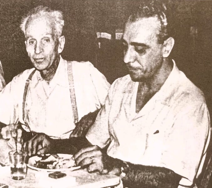 Από αριστερά, ο ποιητής και συγγραφέας Κώστας Βάρναλης και ο συγγραφέας Στρατής Τσίρκας μια Τσικνοπέμπτη στην Πλάκα (φωτ.: ΑΠΕ-ΜΠΕ)