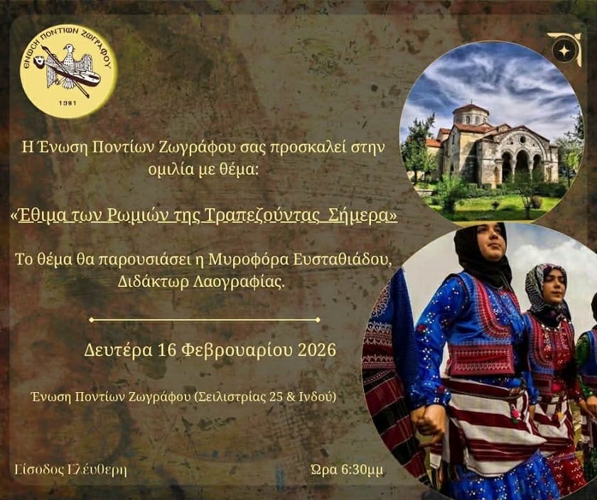 Διάλεξη με θέμα «Έθιμα των Ρωμιών της Τραπεζούντας σήμερα» οργανώνει η Ένωση Ποντίων Ζωγράφου