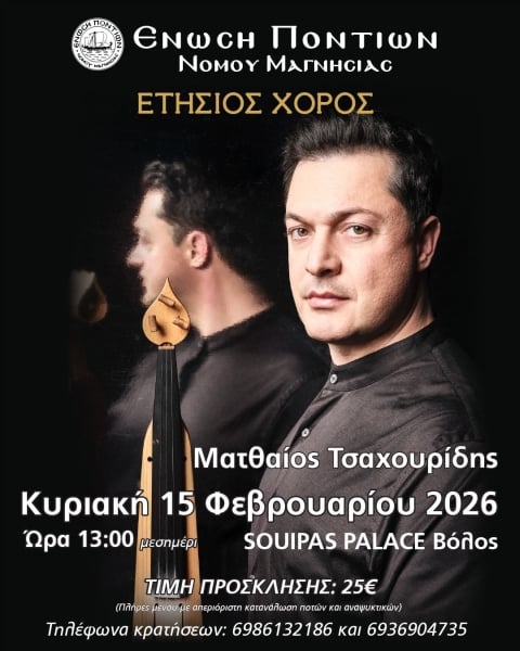 Τον ετήσιο χορό της οργανώνει αύριο, Κυριακή, η Ένωση Ποντίων νομού Μαγνησίας, με καλεσμένο τον Ματθαίο Τσαχουρίδη.