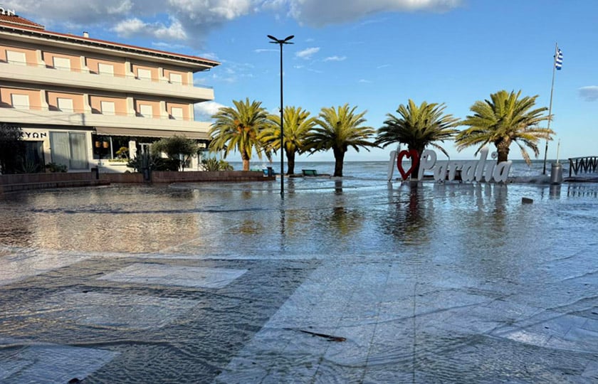 Συγκεκριμένα, απόρροια της επικράτησης ισχυρών νότιων ανέμων υπήρξε η εκτεταμένη κατάκλυση του παραλιακού μετώπου, προκαλώντας καταστροφές στις κοινότητες Παραλίας, Κορινού και στον οικισμό Ολυμπιακής Ακτής.