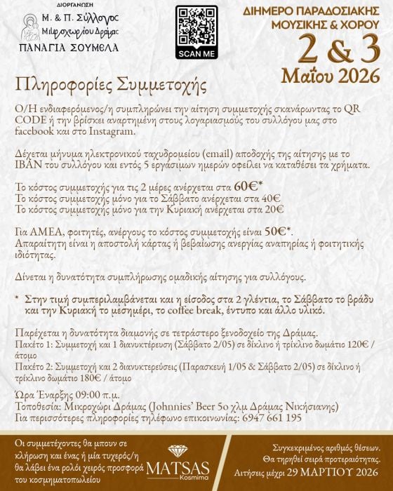 Τις αιτήσεις θα διαχειριστούν μέλη του Μορφωτικού και Πολιτιστικού Συλλόγου Μικροχωρίου Δράμας «Παναγία Σουμελά» που στη συνέχεια θα απαντήσουν στους ενδιαφερόμενους. Ακολουθούν πληροφορίες για το οικονομικό σκέλος της συμμετοχής: