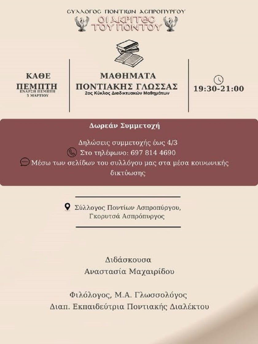 •Για όσους θέλουν να μάθουν από την αρχή ή να ξαναθυμηθούν τη γλώσσα των προγόνων μας, μπορούν να δηλώσουν συμμετοχή έως 4/3 και να πάρουν πληροφορίες στο τηλέφωνο 697 814 4690 ή μέσω των σελίδων του συλλόγου στα μέσα κοινωνικής δικτύωσης.