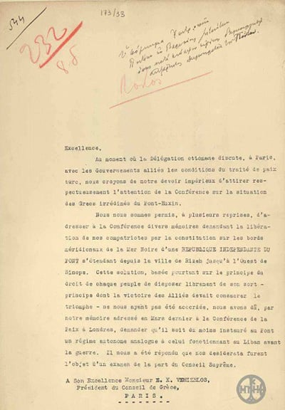 Υπόμνημα της Επιτροπής Ποντίων προς τον Βενιζέλο, με την οποία ζητούν να δημιουργηθεί κατά τη σύναψη ειρήνης ανεξάρτητη Δημοκρατία του Πόντου, 10 Ιουλίου 1920 (ολόκληρο εδώ)