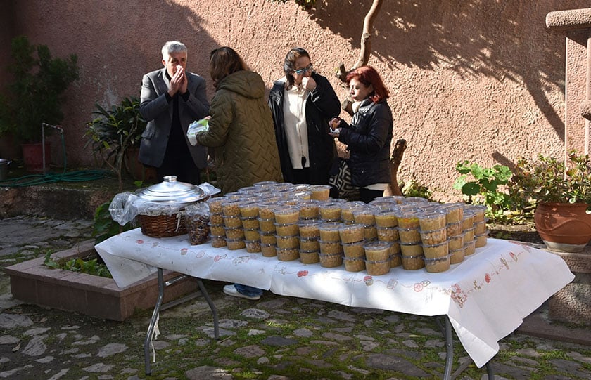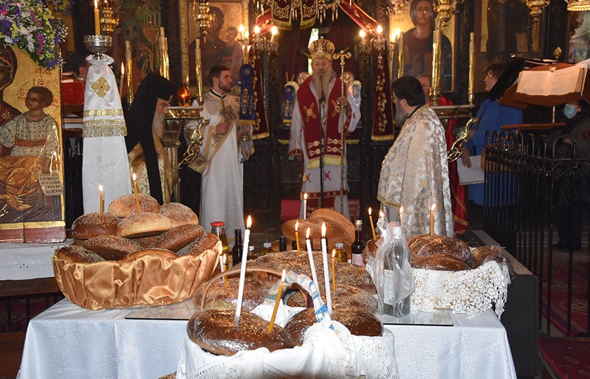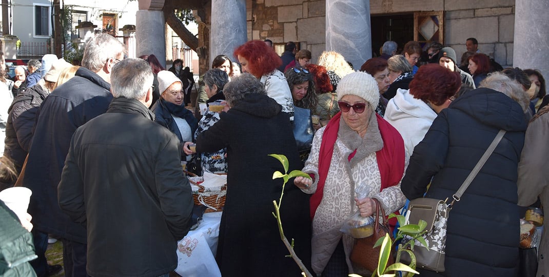 Ακολούθησε η ευλογία του φαγητού από τον παριστάμενο στη γιορτή μητροπολίτη Μυτιλήνης Ιάκωβο και μοιράστηκαν στους παριστάμενους οι μαγειρεμένοι καρποί της γης –περισσότερες από 200 μερίδες φαγητού–, καθώς και οι δεκάδες άρτοι και τα κόλλυβα, στη μνήμη όσων έμειναν πίσω ή πέρασαν πρόσφυγες στη Λέσβο και στην άλλη Ελλάδα.