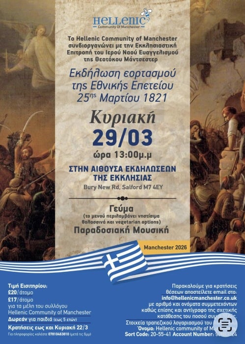 Η Ελληνική Κοινότητα του Μάντσεστερ και η Εκκλησιαστική Επιτροπή του Ιερού Ναού Ευαγγελισμού της Θεοτόκου Μάντσεστερ στη Βρετανία, διοργανώνουν την Κυριακή 29 Μαρτίου, στις 13:00, εκδήλωση εορτασμού της 25ης Μαρτίου 1821.