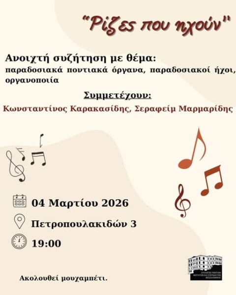 Εκδήλωση με θέμα τους παραδοσιακούς ήχους, την οργανοποιία και τα ποντιακά παραδοσιακά όργανα με τίτλο «Ρίζες που ηχούν» οργανώνει αύριο, Τετάρτη, ο Σύλλογος Ποντίων Φοιτητών και Σπουδαστών Θεσσαλονίκης.
