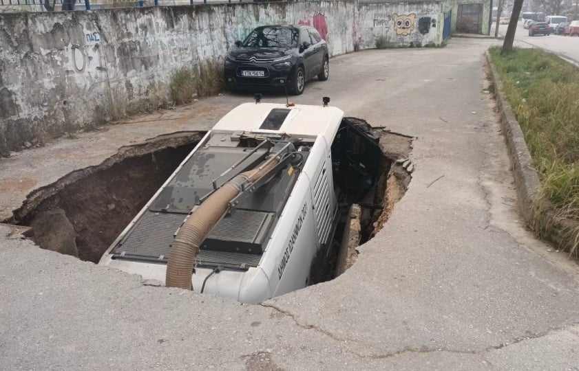 Το μηχάνημα καθαριότητας υποχώρησε μέσα σε έναν μεγάλο κρατήρα που άνοιξε ξαφνικά στη μέση του δρόμου