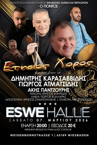 Ο χορός θα φιλοξενηθεί στον χώρο ESWE Halle στο Wiesbaden, από τις 20:00, με είσοδο 20 ευρώ και 5 ευρώ για τα παιδιά έως 12 ετών.