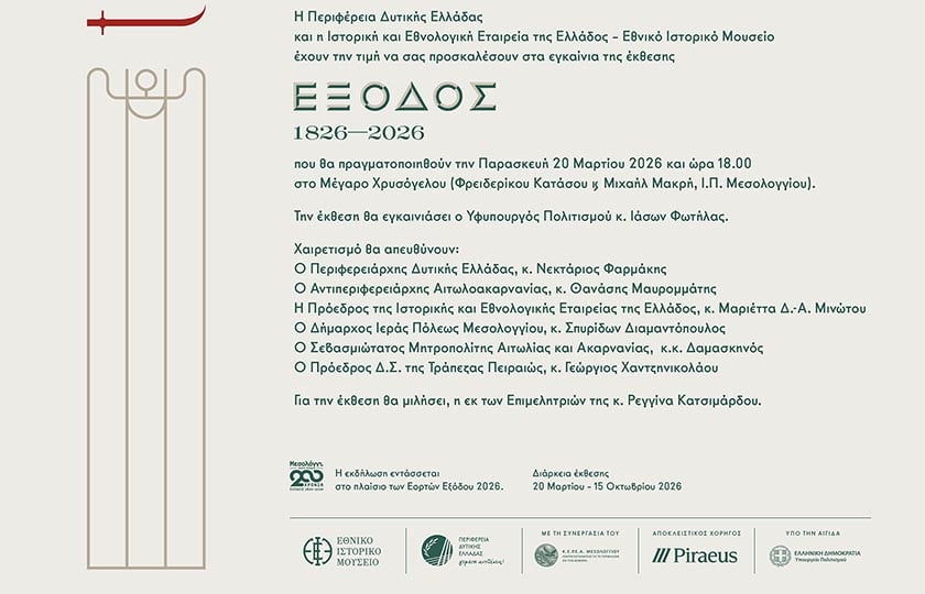 Η έκθεση με τίτλο «Έξοδος 1826-2026» εγκαινιάζεται την Παρασκευή 20 Μαρτίου στις 18:00, στο Μέγαρο Χρυσόγελου, στο ιστορικό κέντρο της Ιερής Πόλης.
