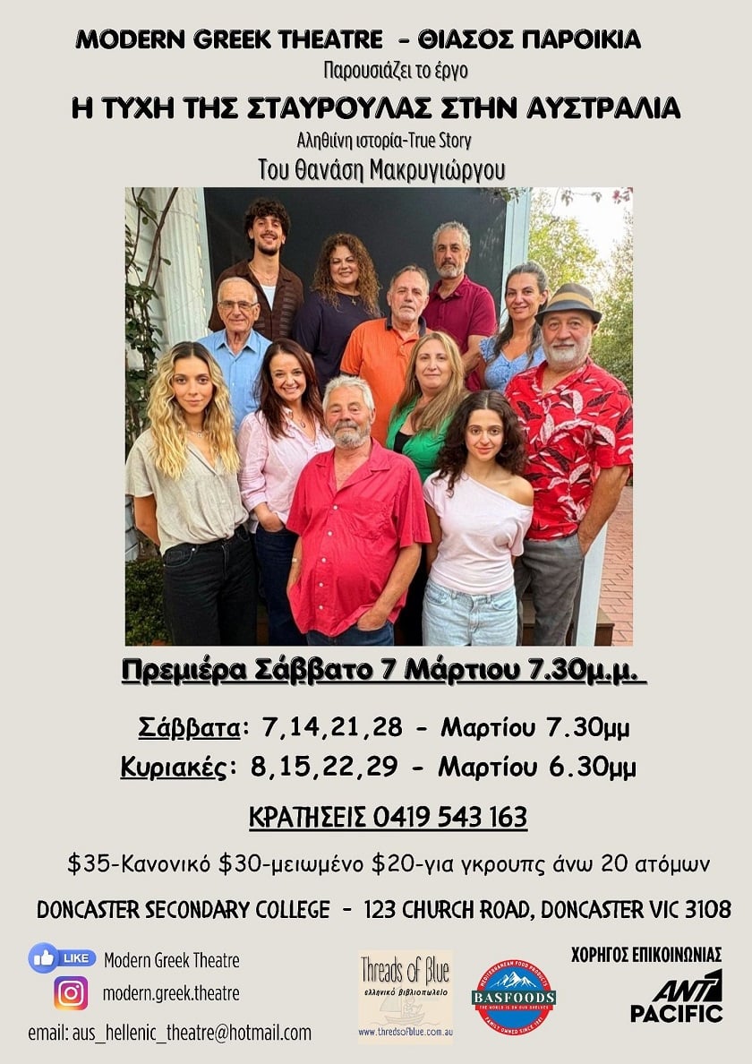 Μια βαθιά ανθρώπινη ιστορία, εμπνευσμένη από τις δύσκολες διαδρομές των Ελλήνων μεταναστών στην Αυστραλία, ανεβαίνει στη θεατρική σκηνή της Μελβούρνης μέσα από τη νέα παραγωγή του θεατρικού θιάσου «Παροικία». Ο σκηνοθέτης και ηθοποιός Θανάσης Μακρυγιώργος, με πορεία άνω των σαράντα πέντε ετών στο ελληνικό θέατρο της διασποράς, παρουσιάζει το έργο του με τίτλο «Η τύχη της Σταυρούλας στην Αυστραλία».