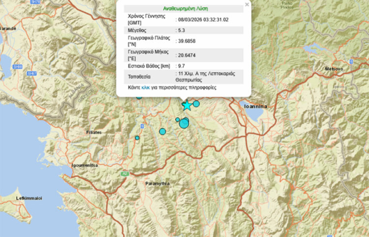 Ο σεισμός έγινε στις 5:32 με εστιακό βάθος μόλις 5 χλμ, γεγονός που εξηγεί γιατί έγινε ιδιαιτέρως αισθητός σε πολλές περιοχές. Το επίκεντρο εντοπίζεται 10 χιλιόμετρα βορειοδυτικά της Λεπτοκαρυάς Θεσπρωτίας, κοντά στα σύνορα με την Αλβανία.