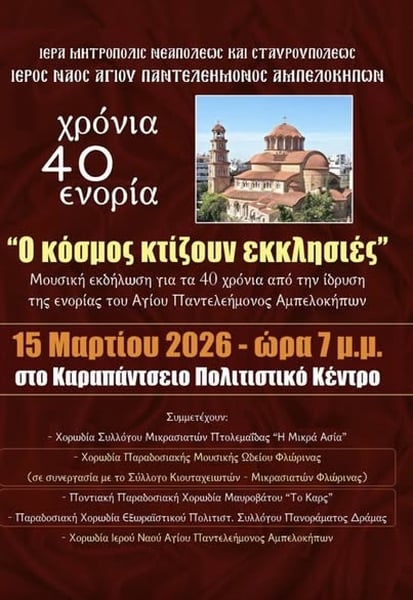 Με μικρασιατικούς και ποντιακούς ήχους θα διανθιστεί η μουσική εκδήλωση «Ο κόσμος κτίζουν εκκλησίες» για τη συμπλήρωση 40 χρόνων από την ίδρυση της ενορίας του Αγίου Παντελεήμονος Αμπελοκήπων, στη Θεσσαλονίκη.