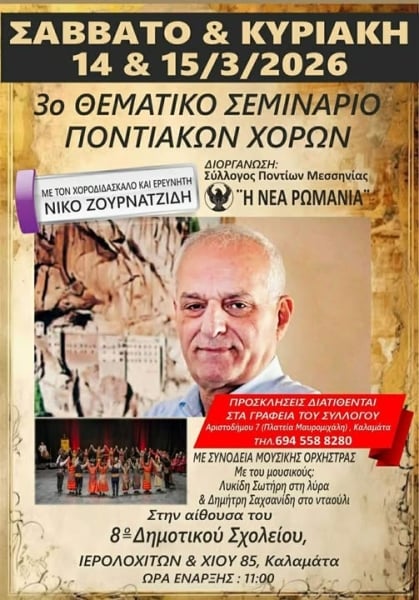 Το τρίτο θεματικό σεμινάριο ποντιακών χορών οργανώνει το σαββατοκύριακο 14 και 15 Μαρτίου ο Σύλλογος Ποντίων Μεσσηνίας «Η Νέα Ρωμανία», με τον χοροδιδάσκαλο και ερευνητή Νίκο Ζουρνατζίδη.