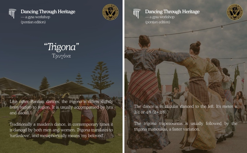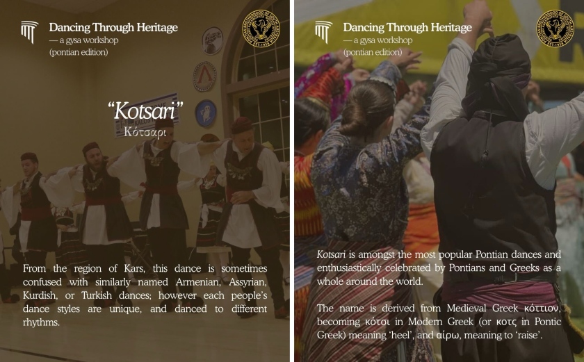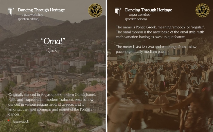 Το εργαστήριο, που θα αρχίσει στις 19:00 (τοπική ώρα) θα αποτελέσει για τους συμμετέχοντες μια ευκαιρία να μάθουν την ιστορία, τον ρυθμό και τις δυνατές κινήσεις που καθιστούν τους ποντιακούς χορούς ένα τόσο μοναδικό κομμάτι του ελληνικού πολιτισμού. Θα παρουσιαστούν οι χοροί Ομάλ, Τρυγόνα και Κότσαρι.